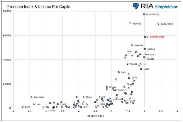 The first scatter plot below is the one we led with. It illustrates the relationship between each country’s Freedom Index and its GDP per capita. The second, involving income per capita and the Freedom Index, provides a more precise measure of how citizens’ wealth relates to economic freedom. Labeling every dot with the corresponding country name would clutter the graph. Accordingly, we only label a limited number of nations across the plot. The Freedom Index is calculated for 165 countries. However, our graphs below include only the 102 nations that also have reliable GDP and income data.