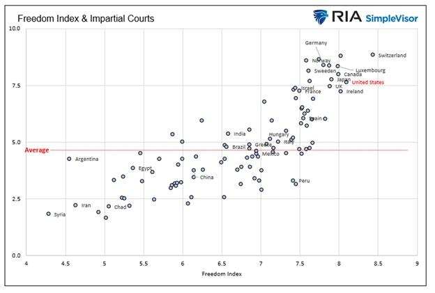 The graph below illustrates a strong correlation between the Freedom Index and its most significant relationship, impartial courts. Interestingly, the graph displays a consistent positive relationship between impartial courts and the Freedom Index across the entire range of the Index. As you may recall, our previous graphs show little correlation between the Freedom Index and income and GDP when the Freedom Index is below 7, and a positive correlation when it exceeds that level.