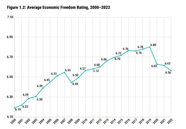 Unfortunately, as we share below, courtesy of the Fraser Institute, the average economic freedom index for all nations has been declining since the Pandemic. Based on the relationships we established earlier, if this trend continues, we should expect global GDP and incomes for most of the largest developed countries to grow at slower rates or decline in some instances.