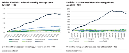 Reddit’s global monthly active users have also plateaued over the past year. In the U.S., monthly active users peaked in the summer of 2024 and have since declined as users lose interest, likely hooked instead on short-form video platforms such as TikTok, YouTube Shorts, and Instagram or Facebook Reels.