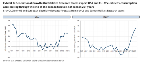 A team of Goldman analysts led by Brian Singer and Carly Davenport told clients that global data center power demand is set to jump 175% from 2023 levels by 2030. In other words, this increase is equivalent to adding a top 10 electricity-consuming nation to the global grid. The revision, up from a prior estimate of 165%, reflects stronger-than-expected AI server shipments, larger data center capacity buildouts, and more bullish outlooks on the digital economy.