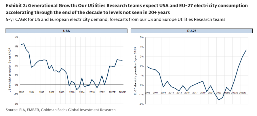 3. Productivity: Will new-gen AI chips and more efficient compute usage in the latest AI models drive lower or higher aggregate power demand? We assume Big Tech cash flow/budgets will be the key constraint, leaving upside risk if there are no constraints and downside risk if compute speed or token demand are finite.