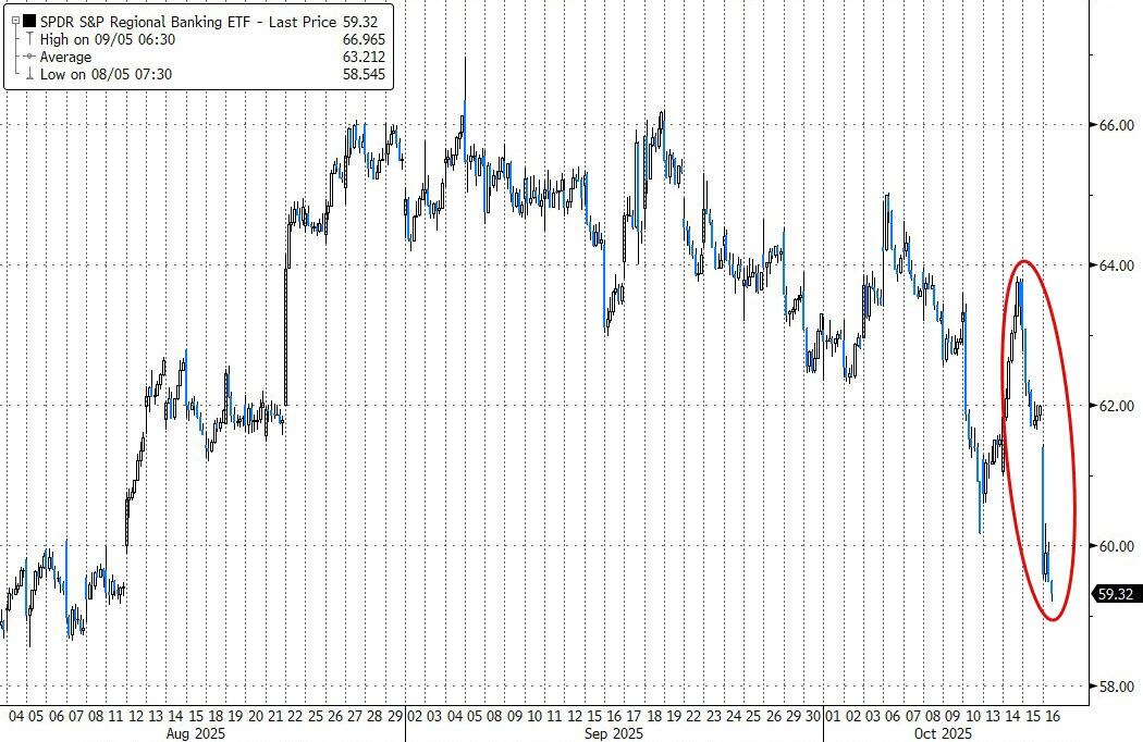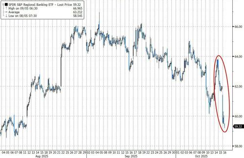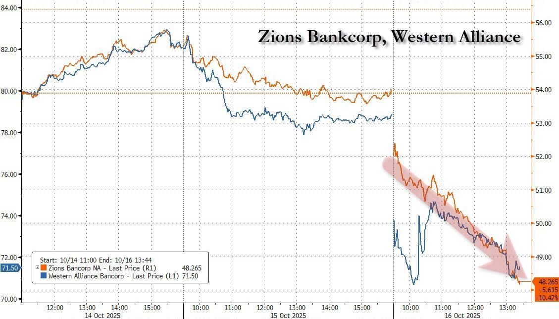 Just when the market was starting to finally freak out – with a one month delay – about the Tricolor and First Brands bankruptcy following yesterday’s fingerpointing session between JPM’s Jamie Dimon and various private credit firms in which both accused each other of harboring more credit “cockroaches“, this morning the credit freak out went to 11 as two regional US banks crashed after they both disclosed problems with loans involving allegations of fraud, adding to concern that more cockroaches are indeed emerging in borrowers’ creditworthiness.