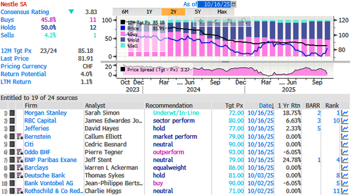 Analysts hold 11 “Buys”, 12 “Holds” and 1 “Sell” on Nestlé with an average 12-month price target of 85 CHF.