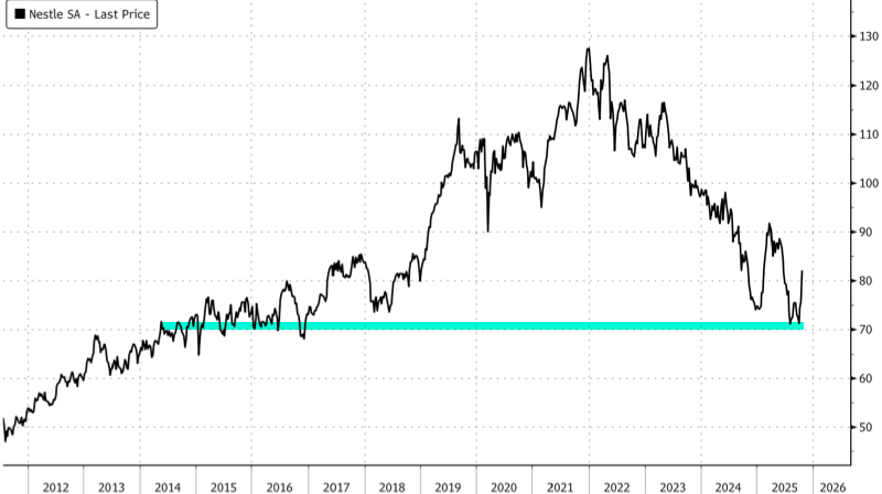 Shares of Swiss food giant Nestlé SA jumped more than 8% in Switzerland today, marking the largest intraday gain in 17 years. This followed the company’s announcement of an acceleration in its turnaround efforts, including aggressive restructuring measures such as slashing 16,000 jobs, or about 6% of its global workforce, over the next two years.