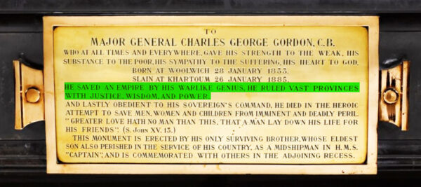 Here are some details of the monument, including Gordon’s hand, resting on a Bible.