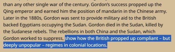 It was the Ching Dynasty that he saved from the Taiping Rebellion. Someone named Amrita Shodham explains that his career “show[s] how the British propped up compliant — but deeply unpopular — regimes in colonial locations.”