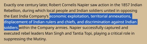 Bengali Taryn Khanam explains what Napier was really up to: “economic exploitation, territorial annexations, displacement of Indian rulers and chiefs, and discrimination against Indian soldiers.”