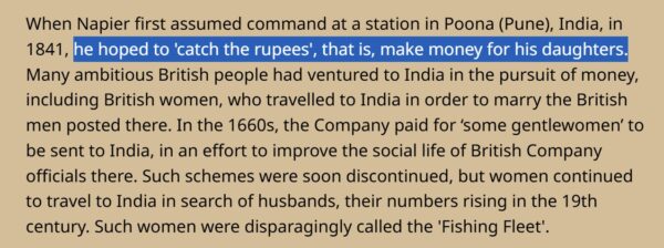 Asif Shakoor goes on at great length about how brutal the British were, but the worst thing he has to say about Charles Napier is that “he hoped to ‘catch the rupees,’ that is, make money for his daughters.”