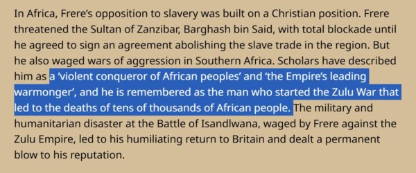 Sanchita Mukherjee explains that Frere was called “a ‘violent conqueror of African peoples’ and ‘the Empire’s leading warmonger, and is remembered as the man who started the Zulu War that led to the deaths of tens of thousands of African people.”
