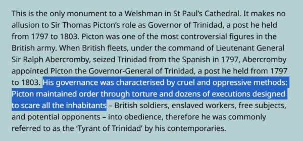 “His governance was characterised by cruel and oppressive methods: Picton maintained order through torture and dozens of executions designed to scare all the inhabitants.” We are told he was known as the “Tyrant of Trinidad.”