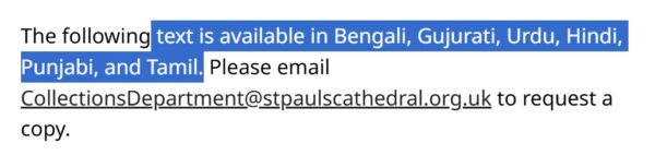 The cathedral notes that for every one of these smears, the “text is available in Bengali, Gujurati, Urdu, Hindi, Punjabi, and Tamil.”