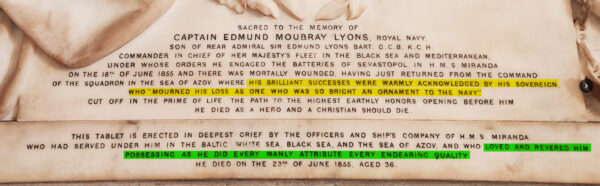 “His brilliant successes were warmly acknowledged by his sovereign” — that would be Queen Victoria — who “mourned his loss as one who was so bright an ornament to the navy.” His officers and men “loved and revered him, possessing as he did every manly attribute, every endearing quality.”