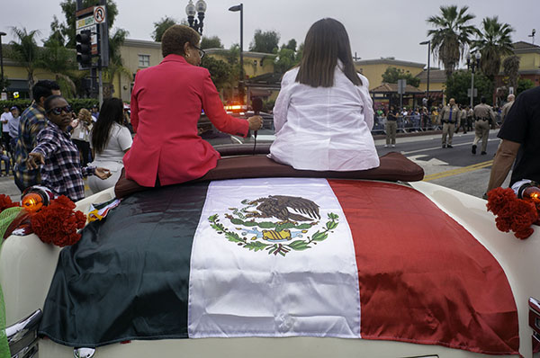 Los Angeles City Attorney Hydee Feldstein Soto and Los Angeles Mayor Karen Bass wave to attendees during the East L.A. Mexican Independence Day Parade in East Los Angeles. (Credit Image: © Armando Arorizo/Prensa Internacional via ZUMA Press Wire)