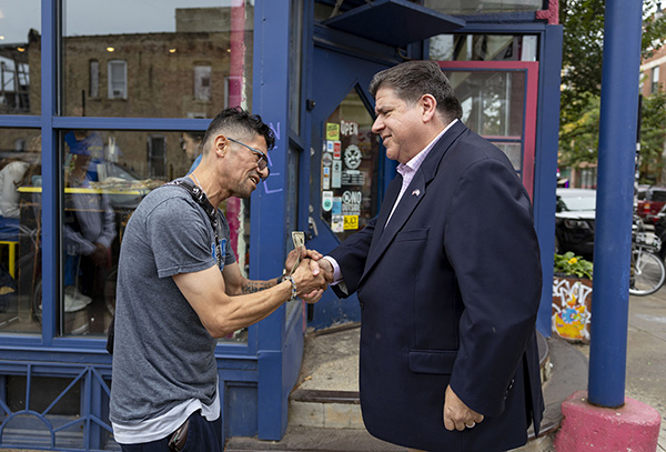 Antonio Cacho, who is originally from Mexico, thanks Chicago Gov. JB Pritzker for his work. (Credit Image: © Brian Cassella/Chicago Tribune via ZUMA Press Wire)
