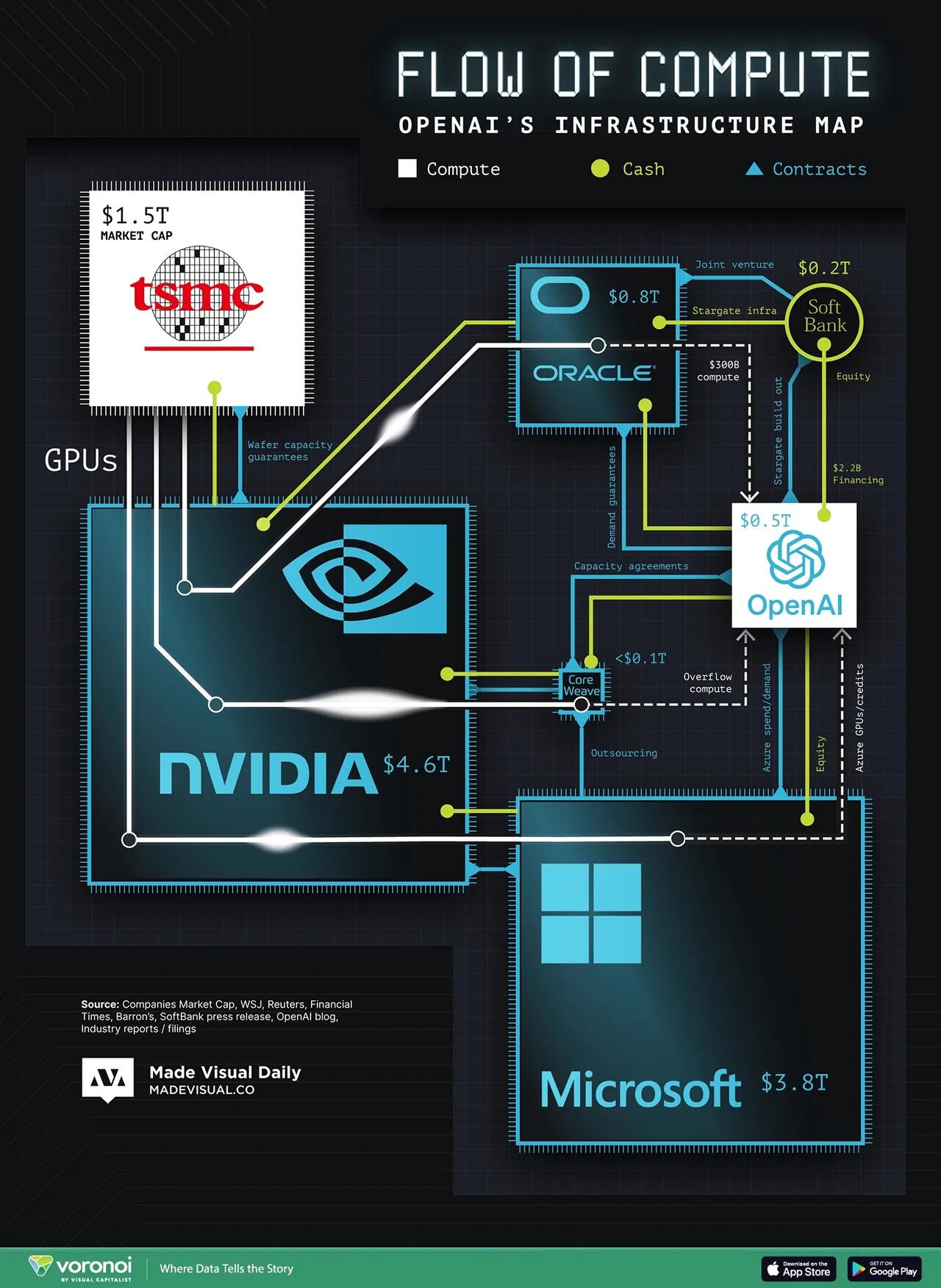 In order to train and deploy cutting-edge AI models like ChatGPT, OpenAI relies on a sprawling infrastructure network involving multiple billion-dollar entities, intricate contracts, and vast capital commitments. A new visualization from Made Visual Daily maps this infrastructure pipeline using three flows—compute, cash, and contracts—highlighting the increasingly circular nature of AI development funding.