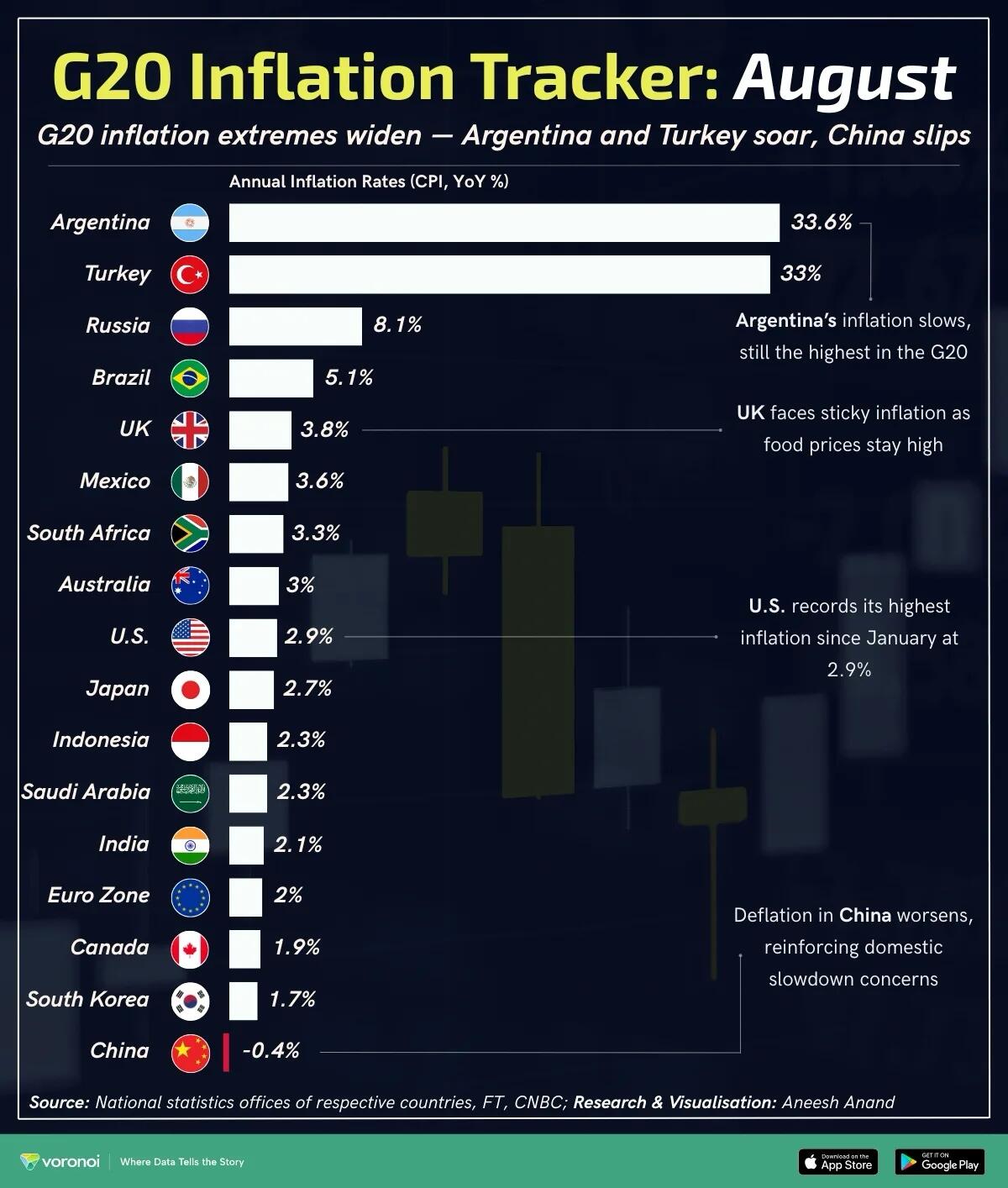 At a glance, Argentina (33.6%) and Türkiye (33%) remain the top two inflation hotspots, while China is the only G20 member in deflationary territory at -0.4%.