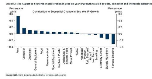 - Industrial production (IP): +6.5% yoy in September (consensus: +5.0% yoy), vs. +5.2% yoy in August. Note sequential figures are highly sensitive to the specific seasonal adjustment methodology (NBS estimates: +0.6% mom sa non-annualized in September, vs. +0.4% mom sa non-annualized in August; GS estimates: +1.4% mom sa non-annualized in September, vs. 0% mom sa non-annualized in August).