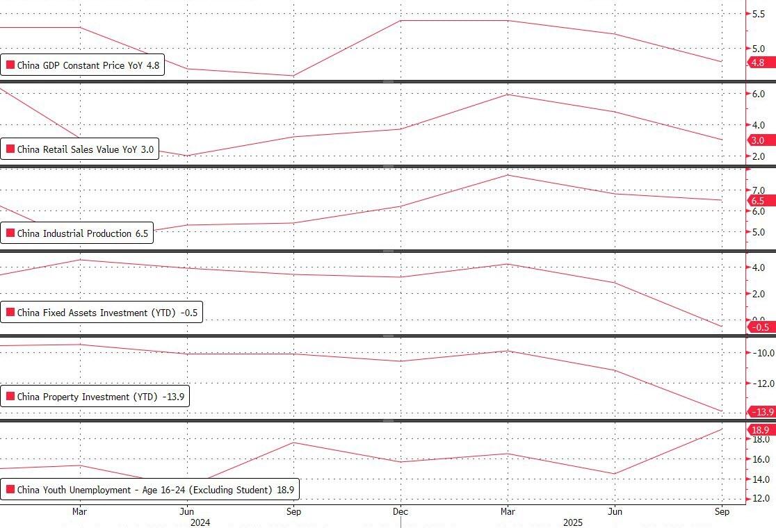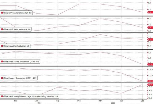 This intense competition among Chinese exporters feeds further weakness at home, with many having to cut wages and even jobs to stay in the race. As noted above, while industrial output grew to a three-month high of 6.5% year-on-year in September, beating forecasts, retail sales slowed to a 10-month low of 3.0%.