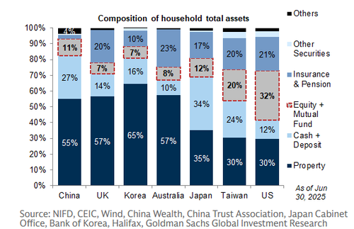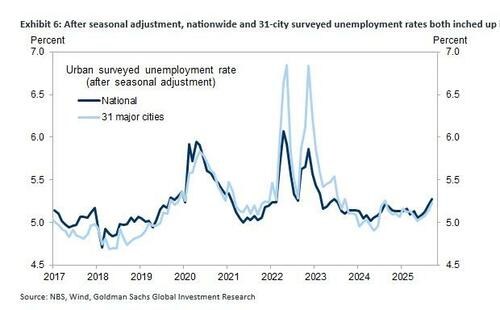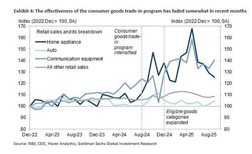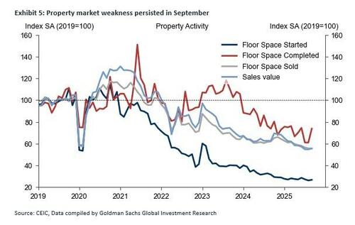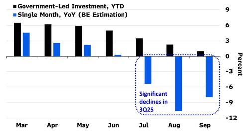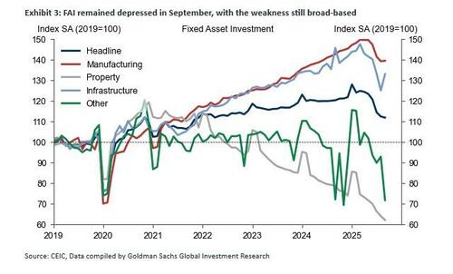 Looking ahead, Goldman writes that the divergent supply and demand trends underscore the need for the government to find effective ways to support growth, even if the economy does not require an additional boost in 4Q. The bank sees less monetary easing in 4Q, with only one possible cut in either the policy rate or the reserve requirement ratio, unlike earlier expectation of moves on both fronts. On the fiscal front, the focus will likely be on implementation and early groundwork for 2026, such as front-loading bond issuance and putting funds in place for projects. The sharp decline in government investment highlights the urgency of identifying more viable investment projects and social programs to spur consumption.