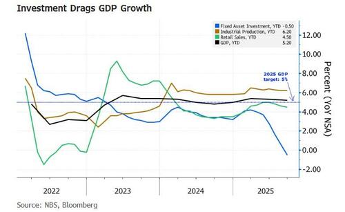 This downbeat view is reinforced by the latest observations from Bloomberg’s Econ team which overnight wrote that China’s 7% investment slump shows deep demand weakness. According to a note published by BBG overnight, China’s latest data dump reassures near-term growth but underscores long-term challenges. Third-quarter GDP growth of 4.8% means the economy only needs to clear a low bar of 4.5% in 4Q to meet the 5% full-year target, helped by a surge in production.