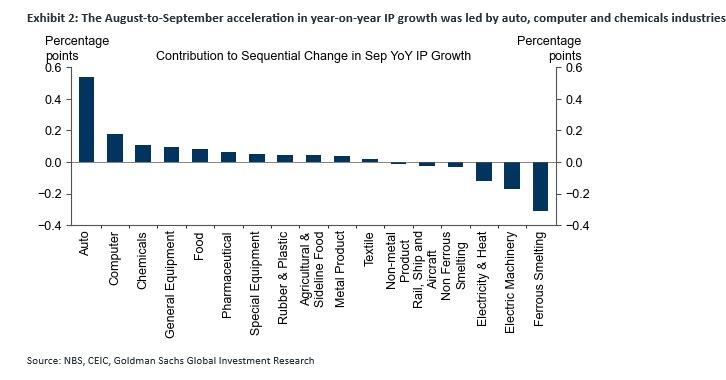 - 2. Industrial production (IP) growth rose to 6.5% yoy in September from 5.2% yoy in August thanks partly to the stronger-than-expected exports and an acceleration in auto output growth. On a sequential basis after seasonal adjustments, IP gained 1.4% mom non-annualized in September (vs. 0% mom non-annualized in August; Exhibit 1). By industry, the August-to-September acceleration in year-on-year IP growth was led by faster output growth in auto, computer and chemicals industries, more than offsetting slower output growth in the ferrous metal smelting industry (Exhibit 2). Among major industrial products (different from by-industry breakdown), auto output growth increased to +13.7% yoy in September from +10.5% yoy in August; computer and industrial robot output growth rose to -5.8% yoy and +28.3% yoy, respectively, in September from -13.1% yoy and +14.4% yoy in August. By comparison, year-on-year growth in power generation and cement output slowed to +1.5% and -8.6%, respectively, in September from +1.6% and -6.2% in August. Crude steel output growth dropped to -4.6% yoy in September from -0.7% yoy in August, and smartphone output growth also eased to +0.1% yoy from +3.2% yoy.