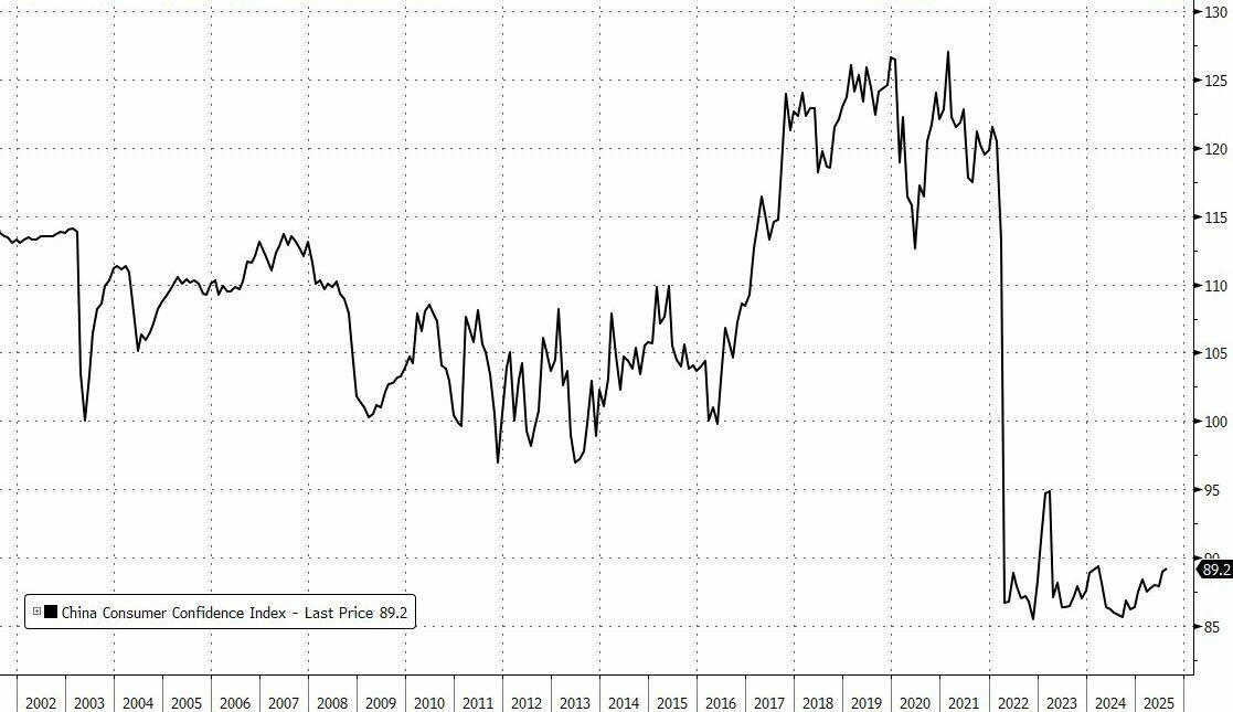 Sure enough, China’s consumer confidence never managed to recovery after the covid crash, suggesting that behind the cheerful rhetoric, the mood on the ground in China is cataclysmic and that contrary to soundbites, should Trump continue to push and prod China in the ongoing trade war, he may well get what he wants.