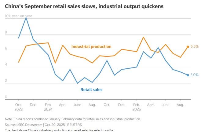 That’s the optimistic view. A rather more realistic one comes from Reuters which writes that Beijing may be using the headline “resilience” in growth as a show of strength in talks between its vice premier He Lifeng and Treasury Secretary Scott Bessent in Malaysia in coming days and a potential meeting between presidents Donald Trump and Xi Jinping in South Korea later.