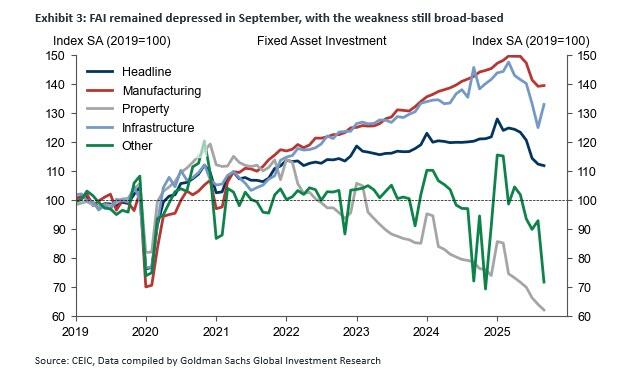 Slowing consumption is another drag on the economy. BBG estimates that retail sales growth fell below the pre-stimulus trend for the first time in September since the government ramped up stimulus in September 2024. In September, catering revenue rose only 0.9% year on year, the same as in June — the lowest growth rate since 2023. This reflected cautious consumption of households — as they spent less on unnecessary items. In addition, home appliance sales have slowed rapidly, indicating that the boost from government subsidies is fading. Sales in September increased 3.3% from a year earlier, far lower than that in August (14.3%) or July (28.7%).