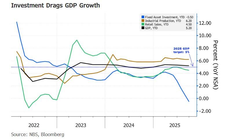 While the 4.8% GDP print for Q3 came fractionally above expectations and kept China on track to reach its target of roughly 5% this year, the economy’s dependence on external demand at a time of mounting trade tensions with Washington raises questions over whether that pace can be sustained. It’s why analysts said further policy support is urgently needed to maintain this stable trajectory and improve domestic demand.