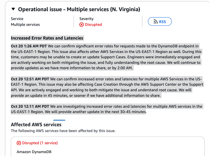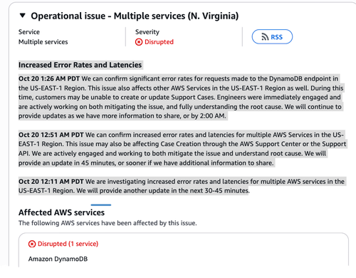 Users may be unable to create or update support cases through AWS’ help system.
