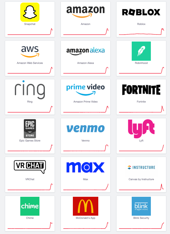 - Widespread slowdowns and outages are being reported across major platforms that depend on Amazon’s cloud, including Snapchat, Roblox, Amazon Alexa, Fortnite, Ring, Robinhood, Venmo, Lyft, and many others.