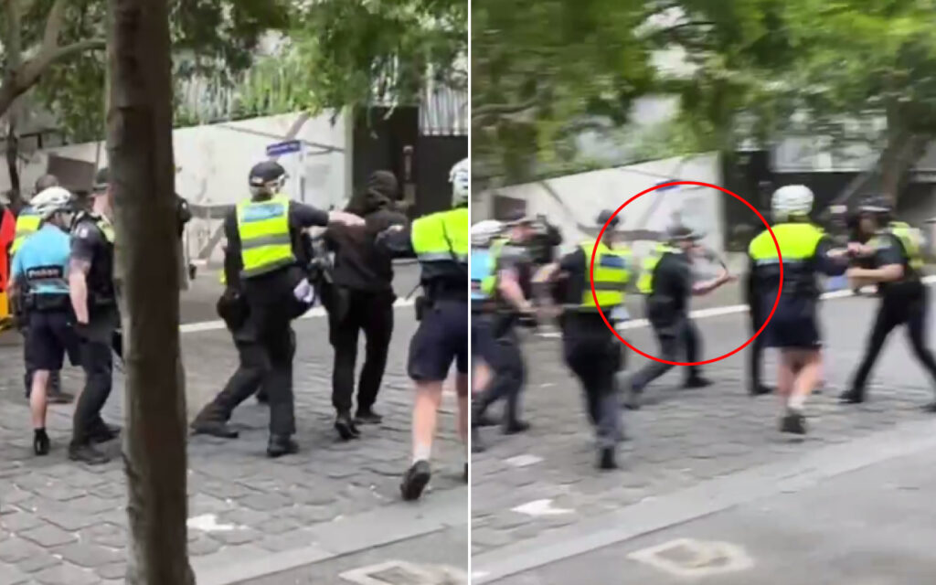 Another clip shows one of the nationalist activists being kicked by a Victoria Police officer before another strikes him with a baton.