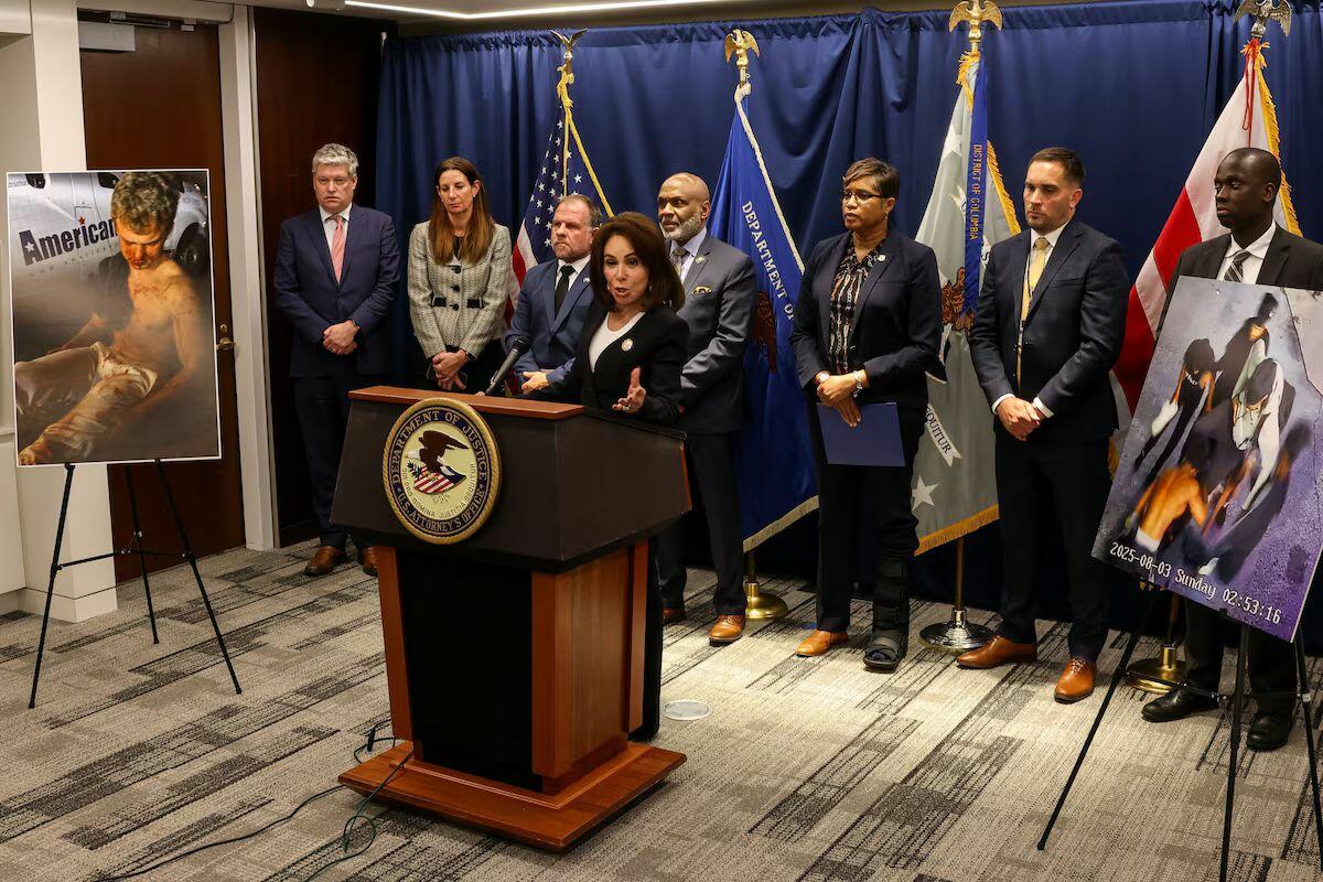 U.S. Attorney Jeanine Pirro speaks at a news conference Monday in Washington after the latest arrests in the assault of former DOGE staffer Edward Coristine. (Kylie Cooper/Reuters)