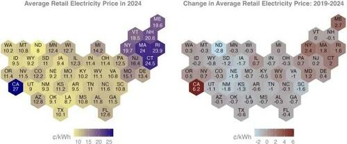 Overall retail electricity prices fell in 37 states from 2019 to 2024 when adjusting for inflation, the researchers said. Driven by wildfire-related costs, inflation-adjusted electricity prices surged 6.2% in California — the most among states, according to the report. Real prices also increased in the Northeast in the five-year period.