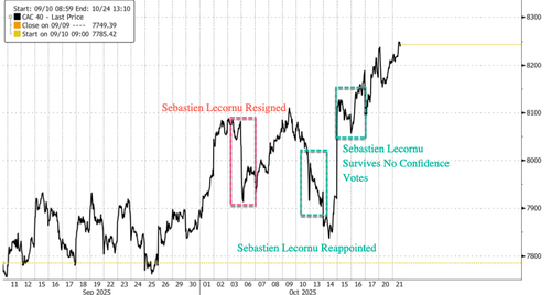 The French blue-chip stock index CAC 40 is higher in Paris afternoon trading, reaching levels not seen since May 2024 and well above those of last week’s political crisis. Prime Minister Sebastien Lecornu’s defeat of no-confidence votes in the French government late last week has certainly cooled the turmoil. However, one UBS analyst tracking the headlines from France believes that Lecornu “might not make it until year-end,” as a highly polarized parliament could make passing a budget nearly impossible.