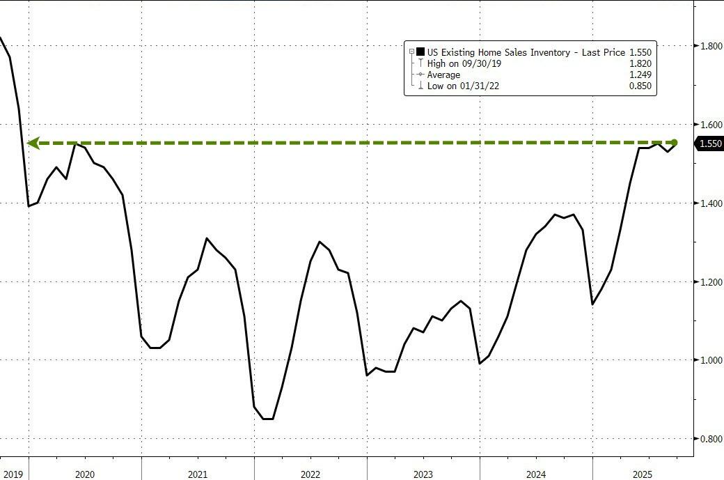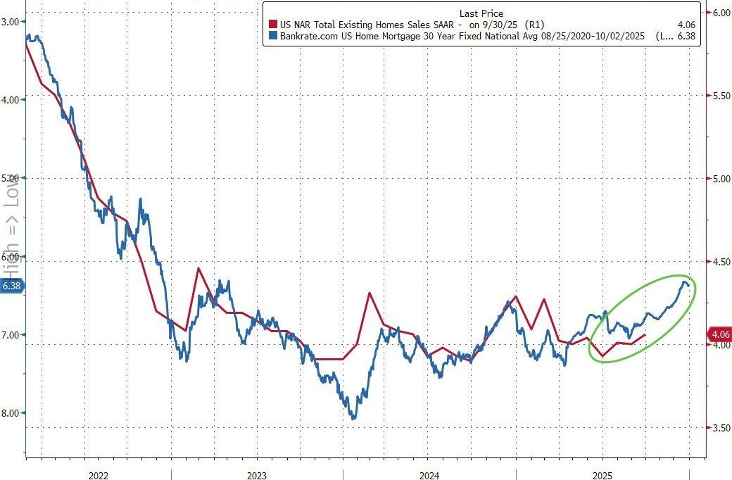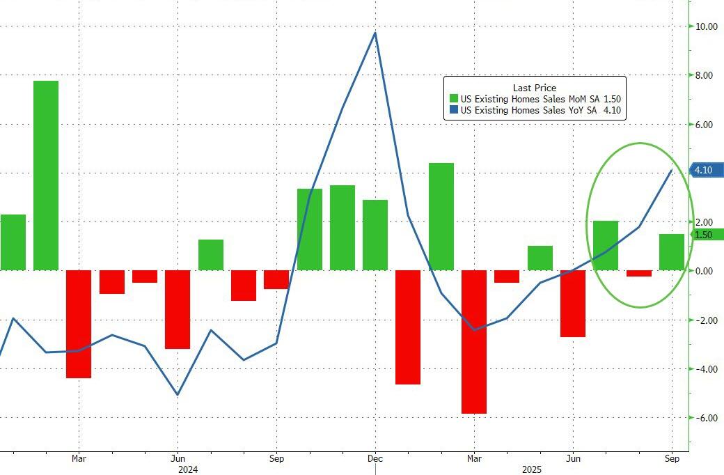 Analysts (rightfully, given the shift in rates) expected a bounce, albeit small (+1.5%), in existing home sales in September and they nailed it (which is a very modest bounce to say the least). On the bright side, existing home sales are up 4.2% YoY – the fastest pace since Dec 2024