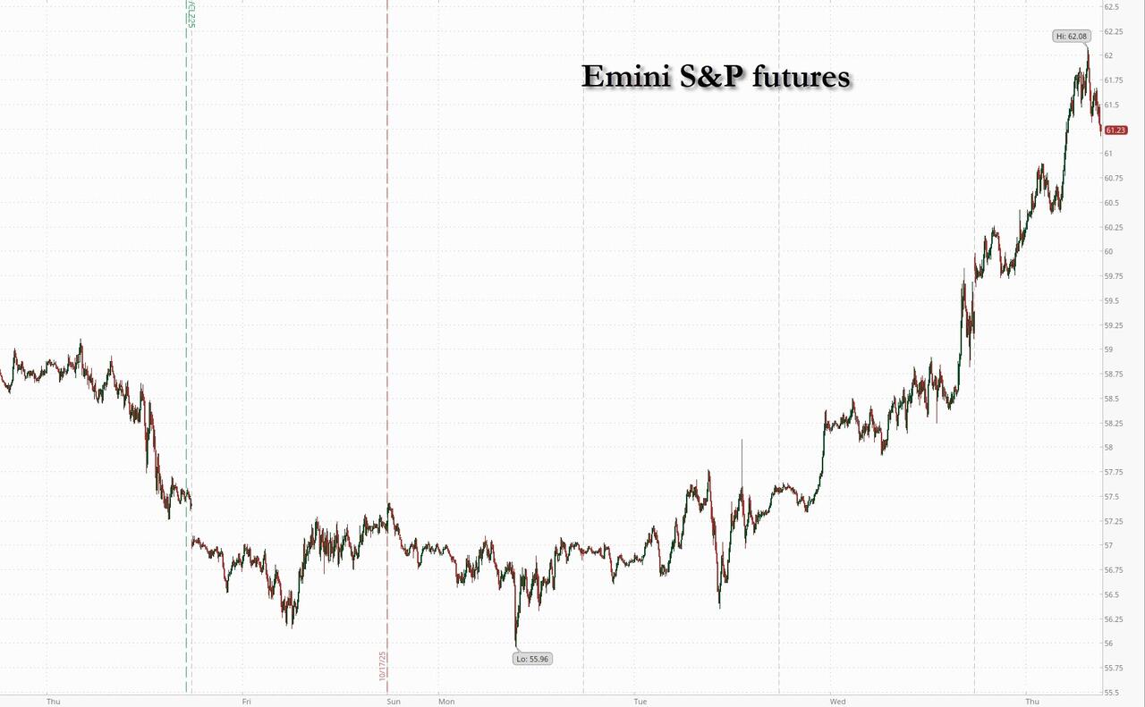 In commodities, WTI crude futures remain more than 5% higher on the day after climbing as much as 5.8% after the Trump administration sanctioned Russian state-owned group Lukoil and Rosneft, ramping up the pressure on Russian President Vladimir Putin to negotiate an end to the war in Ukraine. Brent has jumped by 5% to start testing $66/barrel. Gold turned positive after two days of steep declines as the Trump administration’s latest trade threats introduced fresh tension into US-China relations.