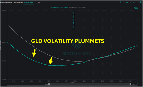 Normally, significant drops cause volatility to spike. Yet as GLD sold off, volatility dropped hard — especially for downside puts.