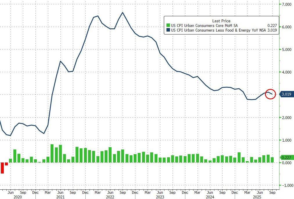 A similar pattern was seen in Core CPI data with the print rising 0.2% MoM (below expectations of +0.3%), but pulled the YoY print down to 3.0% (down from 3.1% in August), the lowest since June…