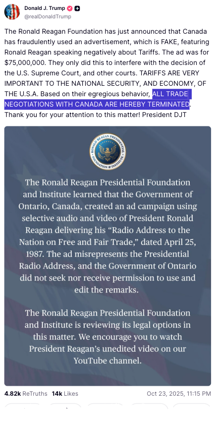 Before Trump’s Truth Social post, on X, the Ronald Reagan Foundation blasted the “ad campaign using selective audio and video of President Ronald Reagan delivering his “Radio Address to the Nation on Free and Fair Trade,” dated April 25, 1987,” adding, “The ad misrepresents the Presidential Radio Address, and the Government of Ontario did not seek nor receive permission to use and edit the remarks.”