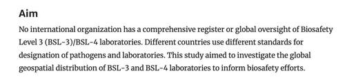 “No international organization has a comprehensive register or global oversight of Biosafety Level 3 (BSL-3)/BSL-4 laboratories. Different countries use different standards for designation of pathogens and laboratories.”