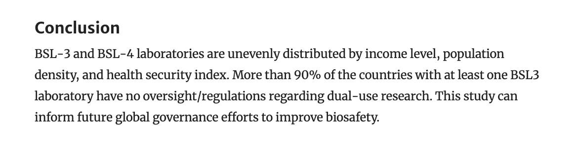 Strikingly, a May 2025 Journal of Public Health study found that more than 90% of the countries with at least one BSL-3 laboratory lacked oversight or regulation of dual-use research of concern.
