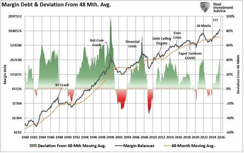 Therefore, for additional “buying power,” investors must turn to leverage. As prices continue to rise, the “fear of missing out” feeds the addiction for leverage, particularly when investor complacency to risk fades. Margin debt, which reflects borrowed funds used to buy stocks, has surged to a record $1.13 trillion. According to FINRA, the five-month spike in margin balances is the most aggressive since the last market peak. The deviation from the 48-month moving average is getting quite extreme.