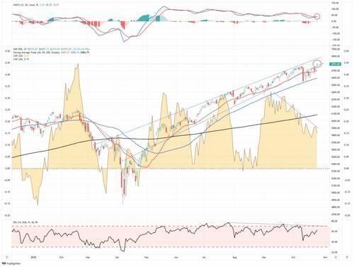 The S&P 500 closed Friday at a record 6,753, confirming a breakout above the previous resistance and setting all-time highs. That breakout vindicated the bulls after a successful test of the 50-DMA support level previously. Furthermore, the market reclaimed the rising bullish trend line from the “Liberation Day” lows and triggered a momentum (MACD) “buy signal, confirming that the bullish bias remains intact. Moving averages also continue to trend higher, reinforcing the overall bullish setup.