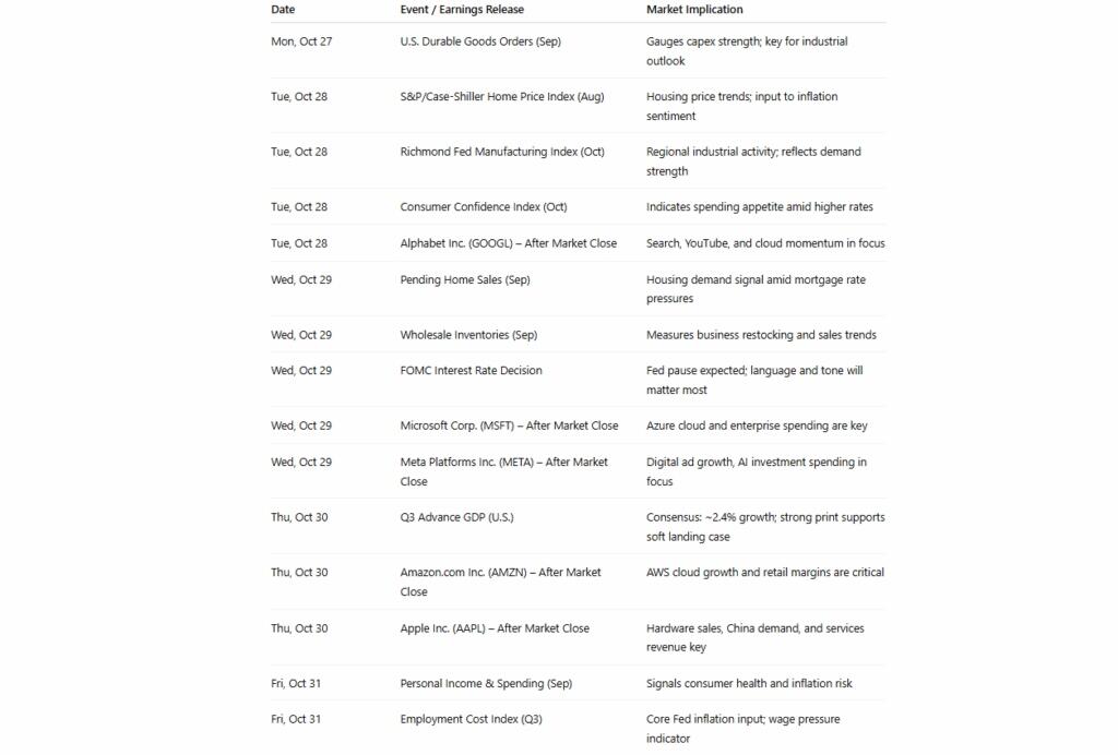 The week ahead is not just busy; it will likely define what happens next. With valuations stretched and markets pricing a perfect scenario, any negative surprise on earnings, growth, or policy could trigger a sharp reversal. Conversely, a clean sweep of strong data and tech earnings beats would reinforce bullish sentiment and push indexes to further new highs.