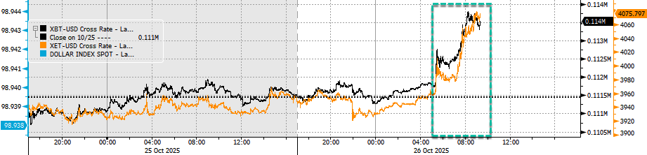 President Trump kicked off his Asia tour by not only signing trade deals across Southeast Asia but also formalizing a ceasefire deal between Thailand and Cambodia. Meanwhile, U.S. Treasury Secretary Scott Bessent and Trade Representative Jamieson Greer met with China’s top trade team on the sidelines of the ASEAN summit in Kuala Lumpur. Those trade talks produced what Bessent called a “successful framework” that would avert a planned 100% U.S. tariff on Chinese goods and set the stage for Trump’s meeting with President Xi Jinping next week, where a broader trade agreement may be finalized. Crypto markets welcomed the new developments. Bitcoin and Ethereum both moved sharply higher early Sunday.