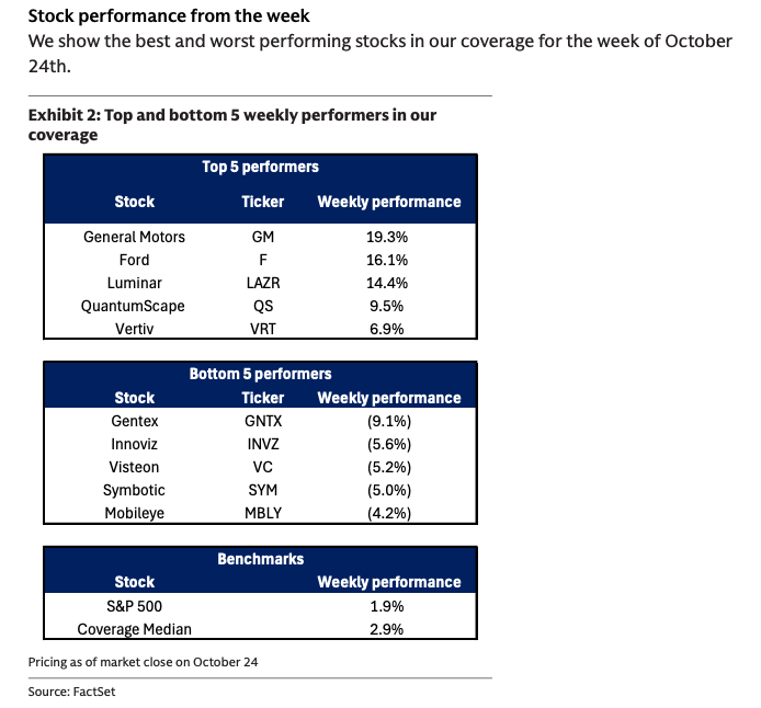 Goldman analysts highlighted several critical themes, including AI, autonomy, and robotics, alongside solid US auto demand, after last week’s earnings from Tesla (TSLA), General Motors (GM), Ford (F), Visteon (VC), Gentex (GNTX), QuantumScape (QS), Mobileye (MBLY), Amphenol (APH), and Vertiv (VRT).