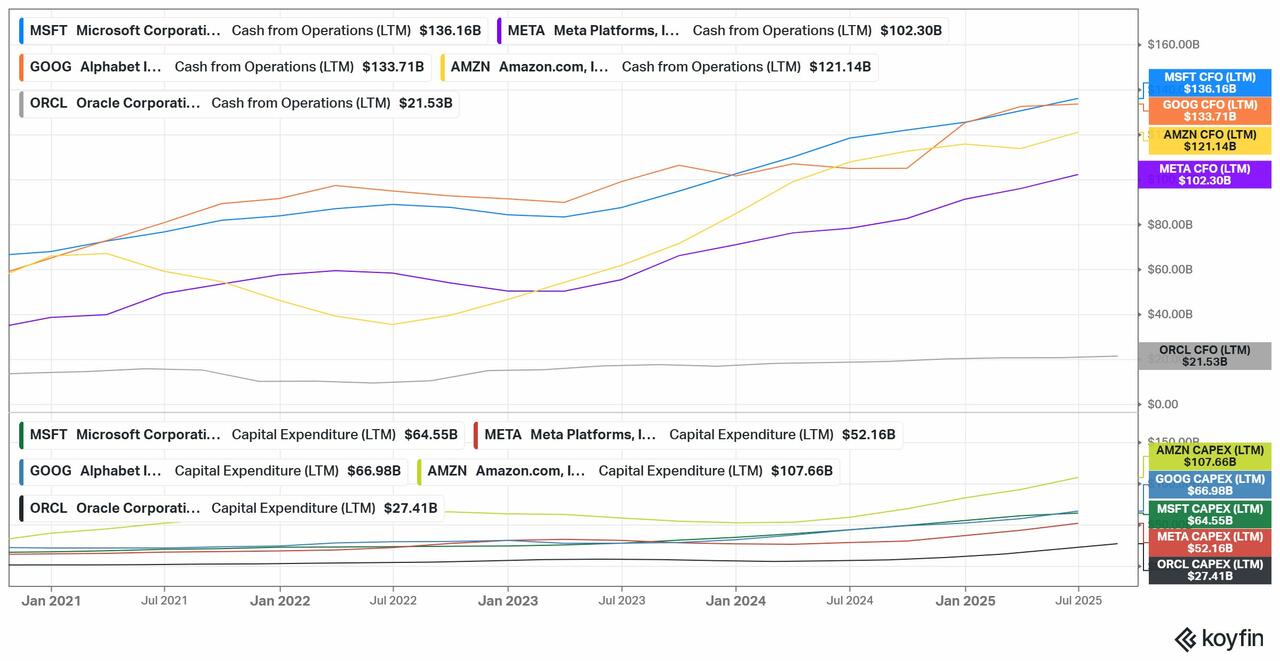 One of the core differences of the current AI revolution from the earlier bubble periods was that almost all of the funding so far has come from operating cash flow (OCF) of some of the most profitable companies on earth. Despite massive capex increases in recent years, all the major public companies (except Oracle) participating in this investment cycle has healthy Free Cash Flow (FCF) so far. Meta, for example, generated ~$50 Billion FCF in the last 12 months although one-third of it was just SBC. But cash is cash…if you need hundreds of billions over multiple periods to get to the promised land, there is still a healthy difference between OCF and Capex of some of these big tech. Investments funded by internally generated cash can go on for a long time as long as market remains receptive to such investments.