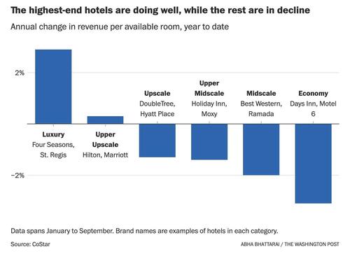 “The upper end is doing okay, but the lower end is decidedly not,” said Jan Freitag of CoStar. “The industry is on a very uneven keel … but the high-end traveler is still traveling.”